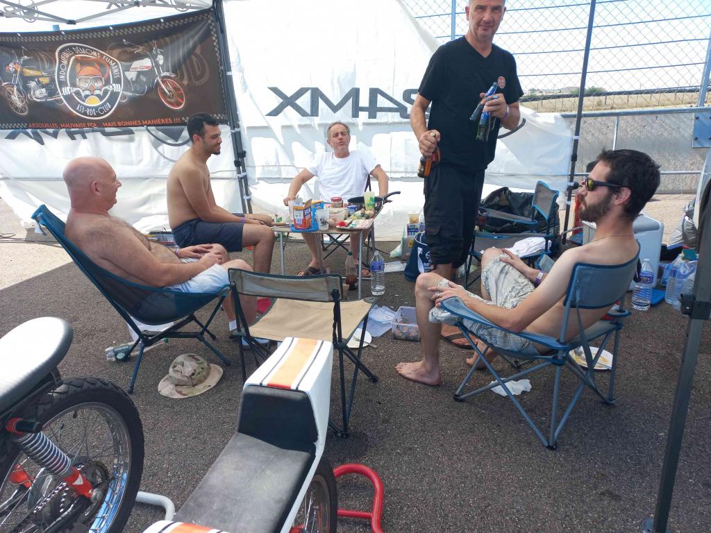 On à pu faire 4 sessions par jour. 2 le matin, 2 l'ap midi. 15' (un peu moins le premier jour, la série des mob de course précédente donnant pas mal de pannes et d'épaves à dégager de la piste). Bonne ambiance, apero le samedi soir, et donc méteo plus qu'estivale !!!