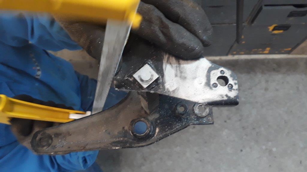 couper à raz, et garder une surface plane : c'est sur ce gros carré traversant que vont etre soudé de part et d'autre 2 insert M8 pour supporter les commandes reculées . ne pas enlever trop de matiere au carré . des deux cotés